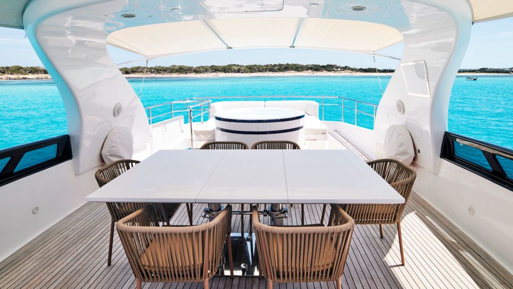Sombrilla, tumbonas delanteras y traseras, zona de estar interior y exterior, fly bridge, conexión de música por bluetooth, A/C, sistema de sonido interior y exterior Void, cocina totalmente equipada, jacuzzi en cubierta